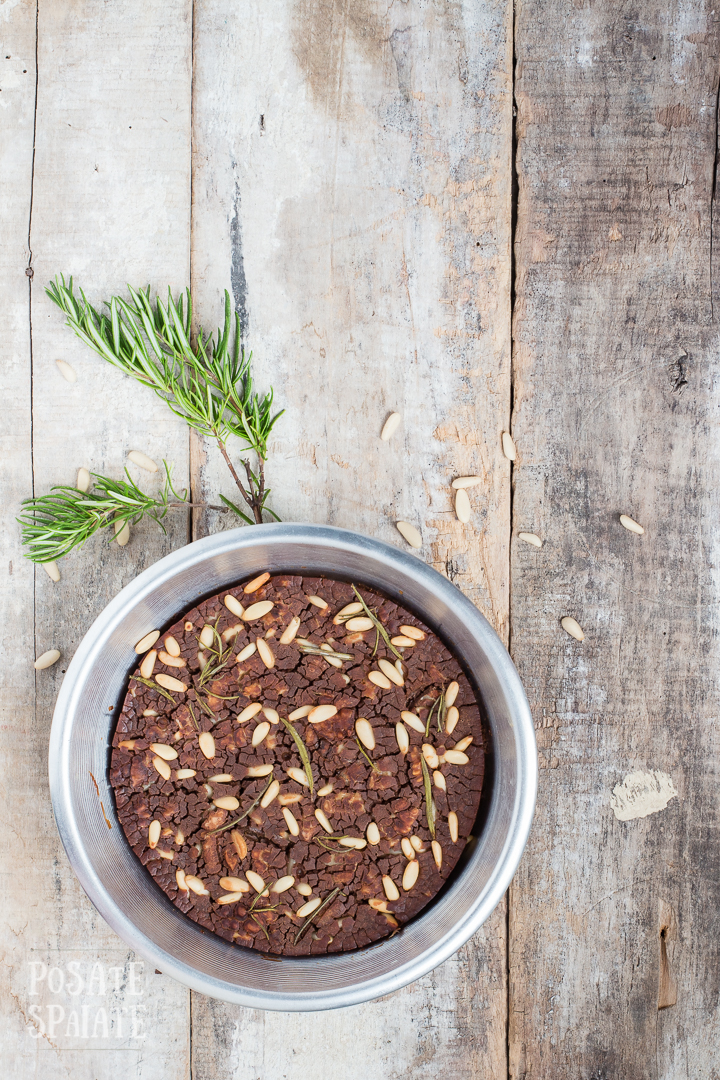 4. Spennella la teglia di olio evo, riempila con il composto e completa con i rimanenti pinoli, uvetta, aghi di rosmarino e un giro d’olio. Lo spessore ottimale è di circa 2 cm affinché il castagnaccio sia croccante fuori e morbido dentro.