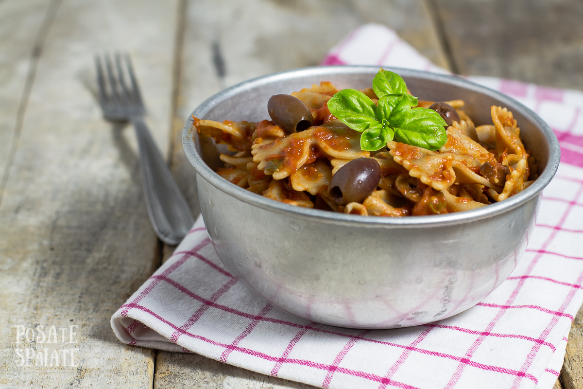 Pomodori pelati o salsa fatta in casa, una manciata di olive, un pò di peperoncino e le ultime foglie di basilico della piantina sul balcone. E poi la pasta integrale, più nutriente e saporita, io ho usato le farfalle integrali di Pasta Toscana che contengono farina di semi di lino e quindi Omega 3.