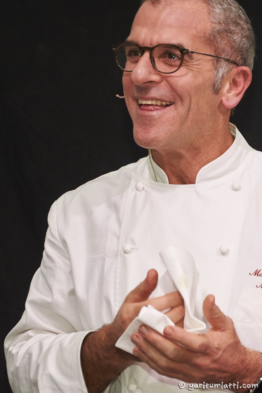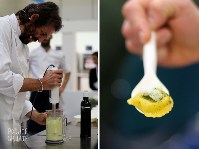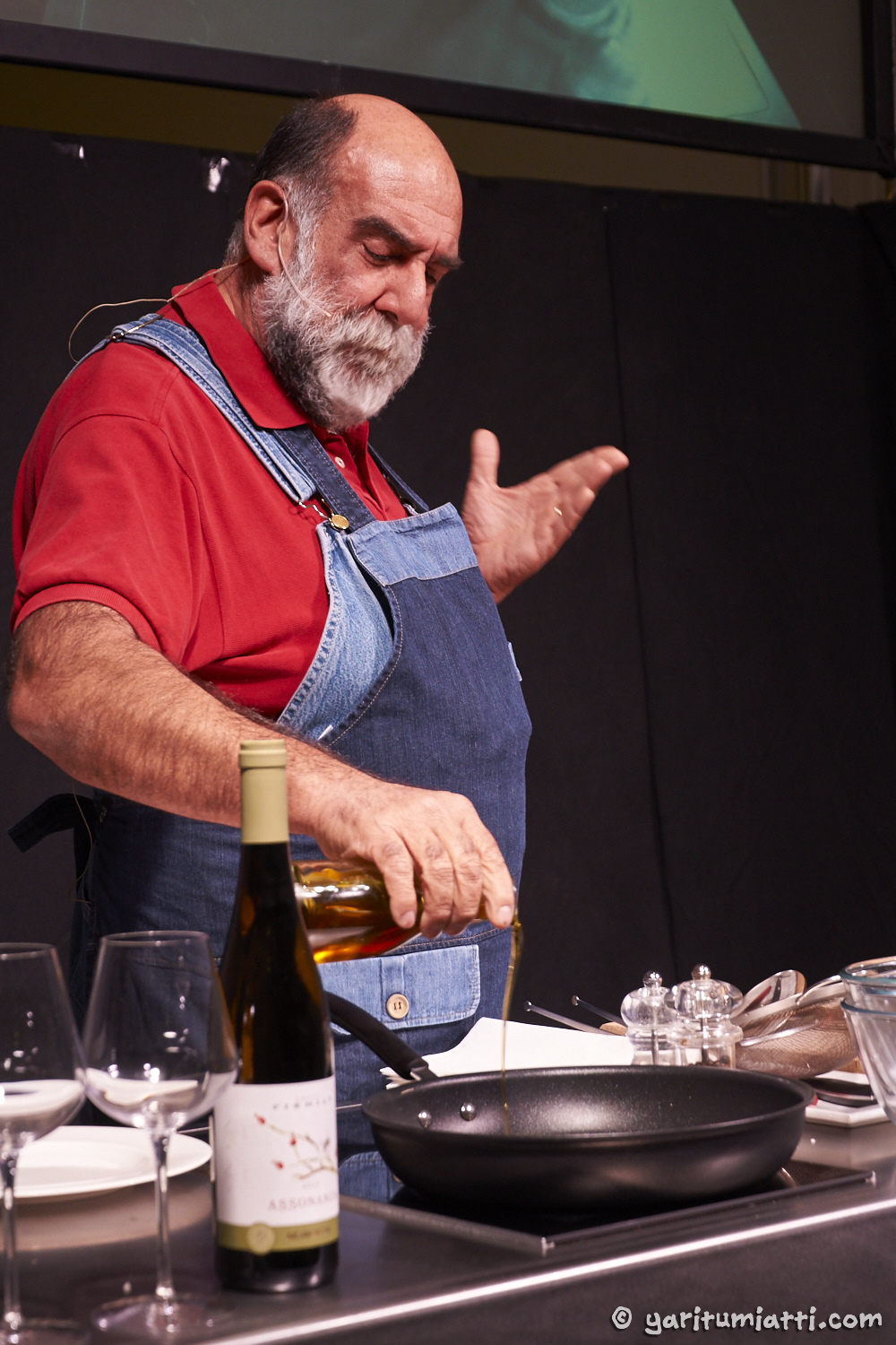 In poco più di un’ora ci ha raccontato la sua filosofia in cucina, ci ha invitato a smetterla di farci troppe domande sull’alimentazione provando a nutrire l’anima e non solo il corpo. Il segreto per nutrirsi bene sta in una alimentazione varia a base degli ingredienti sani che il nostro territorio ci offre. Come l’olio extravergine con il suo sapore fresco, con i sentori erbacei, un velo di amaro e una punta di piccante.