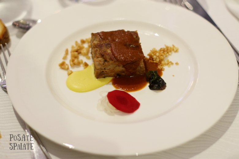 Igles Corelli ci ha raccontato che la carne di maiale si può far cuocere anche più di 15 ore a bassa temperatura per creare il Cubo di mora romagnola con salsa barbecue, una delizia accompagnata anche dalla composta di mele cotogne e verdurine croccanti in agrodolce. Vino in abbinamento Terolengo Riserva 2012 Castel Firmian