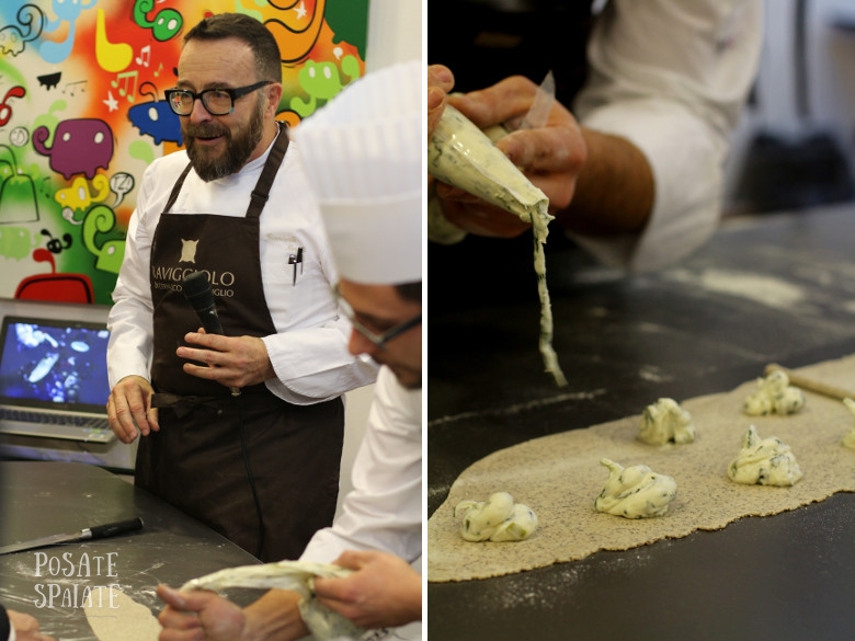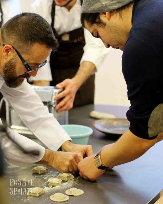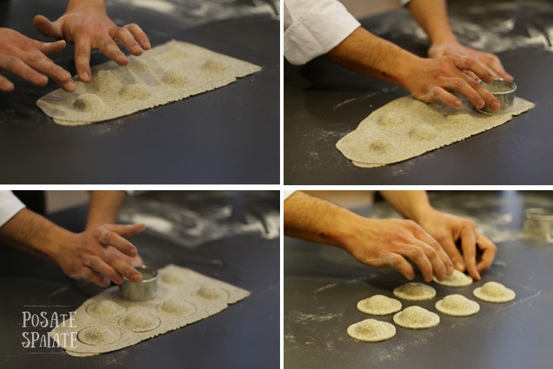 E’ stato molto interessante vedere il procedimento per creare il Raviggiolo: si parte da una sfoglia sottile di pasta di grano saraceno. Con una tasca da pasticcere si formano delle noci di ripieno che vengono poi ricoperte da un altro strato di pasta. Si fa uscire l’aria in modo che i due strati di pasta aderiscano bene al ripieno e poi si taglia la circonferenza col coppa pasta. L’ultimo passaggio è quello decisivo: intorno alla cupoletta di ripieno si pizzica la pasta quattro volte per dare la caratteristica forma al Raviggiolo.