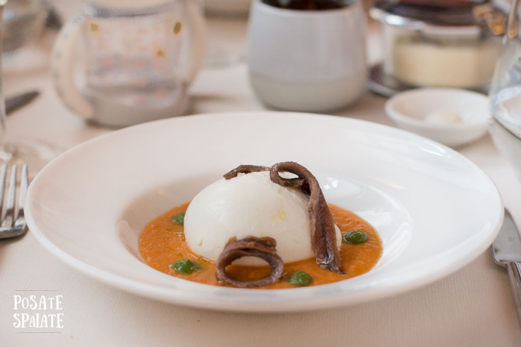 Fior di latte, gazpacho, acciughe del Cantabrico e pesto. Qui c’è l’estate: il profumo del pomodoro dolce e succoso, il carattere del peperone e della cipolla. Il basilico. La mozzarella fresca e la sapidità delle acciughe.