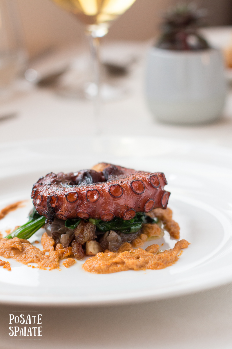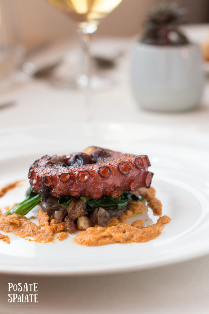 Tentacolo di polpo scottato in olio al chorizo, salsa romesco, spinaci e insalata tiepida. La consistenza quasi burrosa del tentacolo di polpo cotto a bassa temperatura e scottato, su letto di cipolle e uvette con la loro dolcezza. La salsa romesco, di origini catalane, è un concentrato di aromi a base si nocciole e peperoni. L’olio al chorizo completa regalando carattere al piatto. Una nota leggera di cumino lega i sapori.
