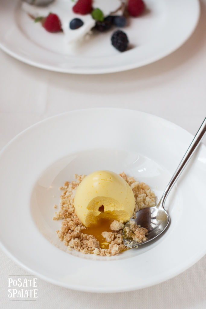 Uovo allo yogurt e cioccolato bianco, frutto della passione e crumble allo zenzero. Un parfait cremoso, dolce ma non troppo con il cuore aspro e profumato del frutto della passione che esce a sorpresa dopo la prima cucchiaiata.