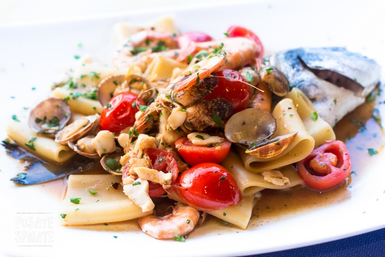 I paccheri freschi, non posso che descriverli come ha fatto Fabio, il padrone del locale innamorato del mare e dei suoi piatti: “acqua e farina, passati in padella con vongole veraci e la loro acqua. Gamberetti pomodorini pachino, prezzemolo, aglio, un tocco di peperoncino e amalgamati con la polpa di una orata sfilettata testa coda”.