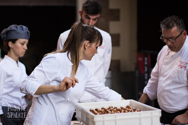 Babà piastrato al burro con foie gras e marmellata di fichi Agrimontana (pasticceria121), Battuta al coltello con scaglie di pistacchi e mango (macelleria Barberis), Rigatoni come caramelle (Pastificio Bolognese).