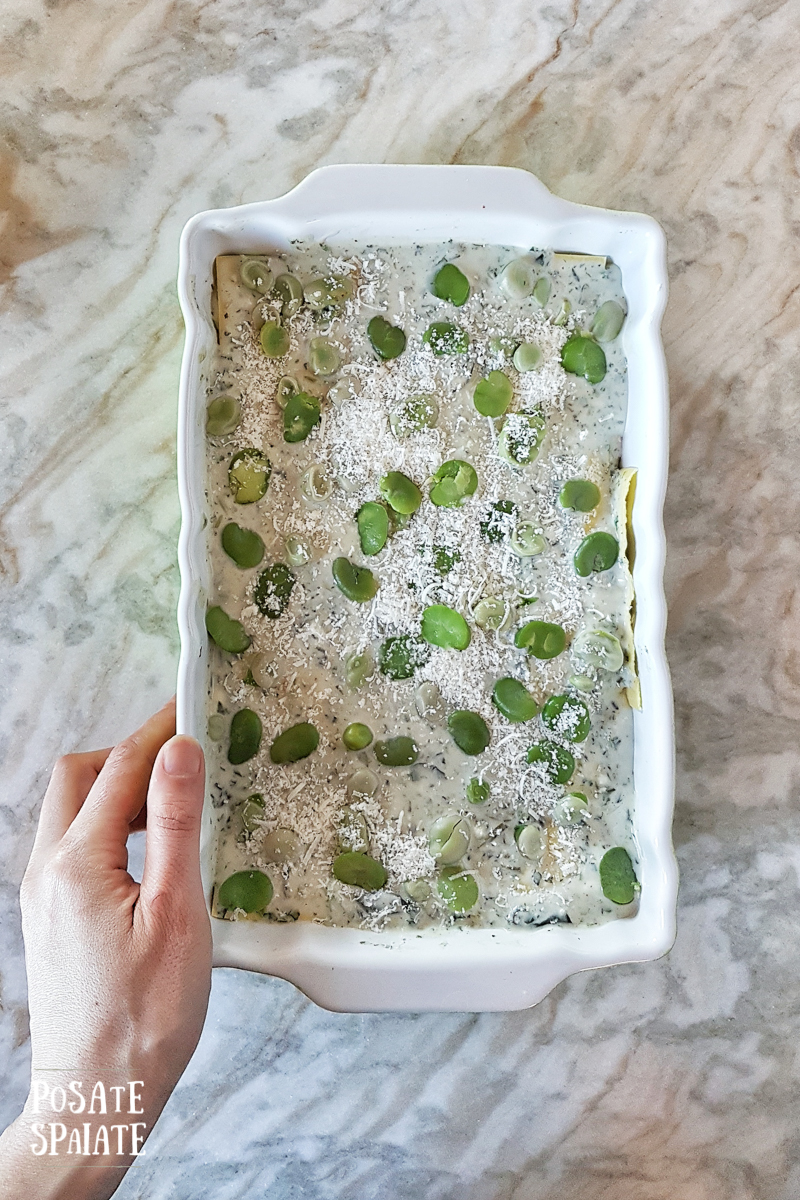 Componete le lasagne: distribuite nella teglia un po’ di composto di ricotta poi la sfoglia, altra ricotta, erbette, la feta sbriciolata, il parmigiano e le fave.