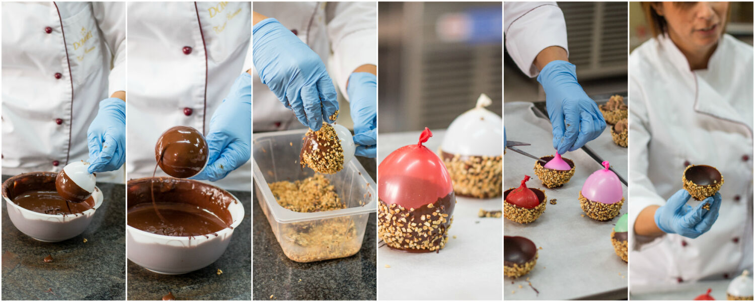 Dopo la visita allo stabilimento, ho partecipato ad un laboratorio per imparare ad usare il cioccolato Domori, che è perfetto per la pasticceria. Abbiamo preparato le mezze sfere di cioccolato fondente con granella di nocciole e ganache montata, un dolce in grado di esaltare gli aromi giocando con le consistenze.