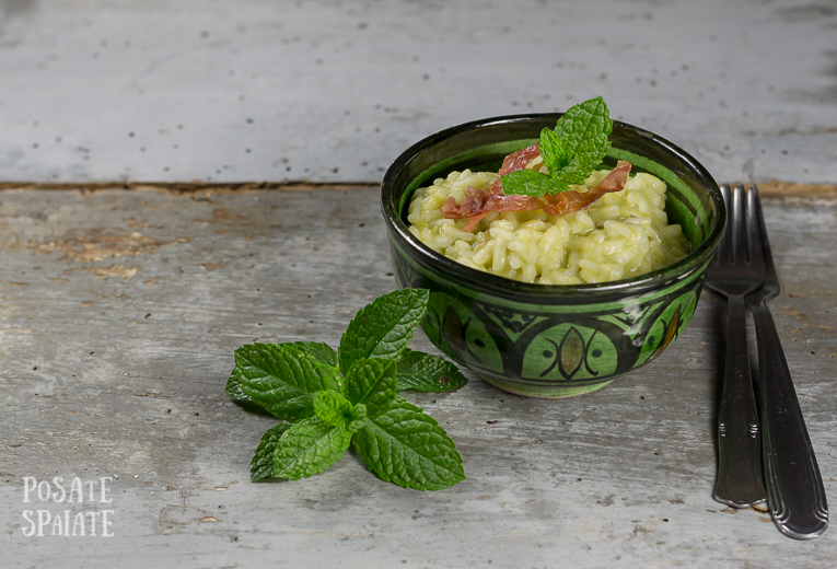 Riparto da una ricetta: dopo aver mangiato fuori per due settimane avevo voglia di qualcosa che avesse il sapore di casa. Un risotto morbido, profumato con la menta del mio balcone, che è sopravvissuta alla nostra assenza grazie alle cure amorevoli della mia sorellina.