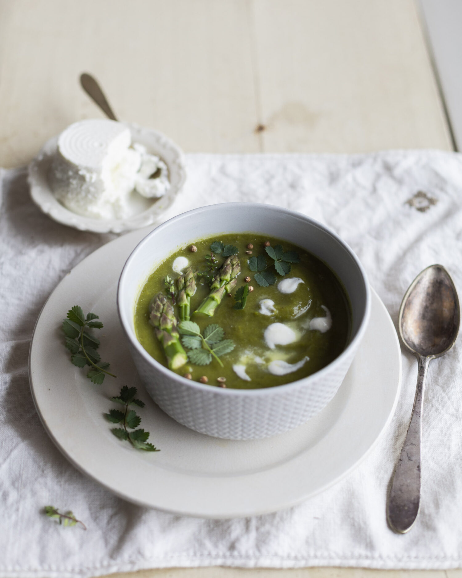 • Servi calda o tiepida decorando ogni piatto con le punte di asparagi scottate in padella, le erbette fresche, semi di coriandolo e una crema di ricotta e kefir (o yogurt).
